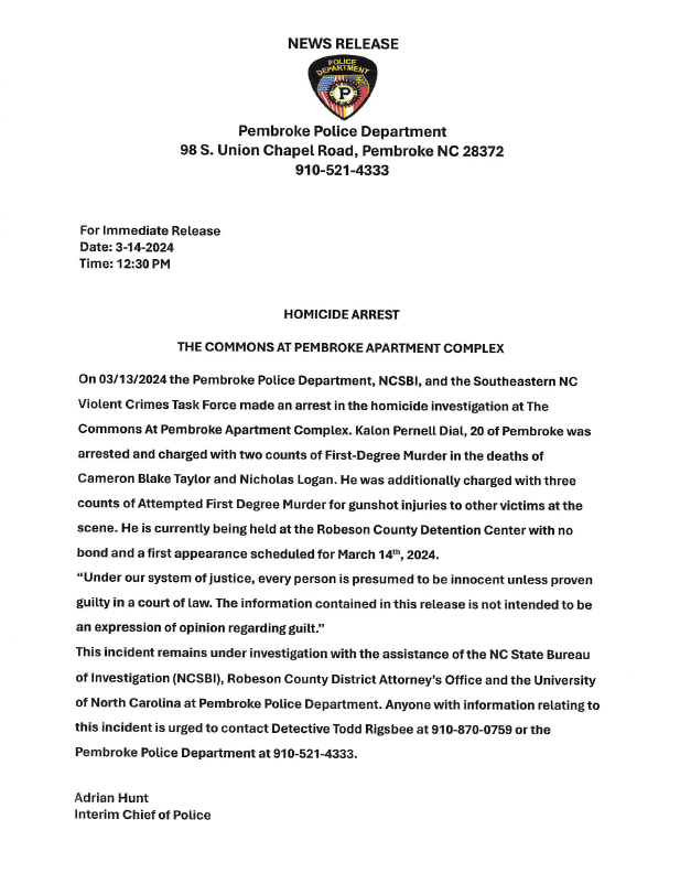 NEWS RELEASE Town of Pembroke Pembroke Nc Arrests Find inmates at pembroke nc police jail. (wpde) — the robeson county sheriff's office announced on tuesday night that they have arrested 12 people as part of an ongoing investigation into. View and search recent bookings and see mugshots in robeson county, north carolina. Records request and mugshots in pembroke north carolina. Find robeson county arrest, court, criminal, inmate, divorce,. Pembroke Nc Arrests.