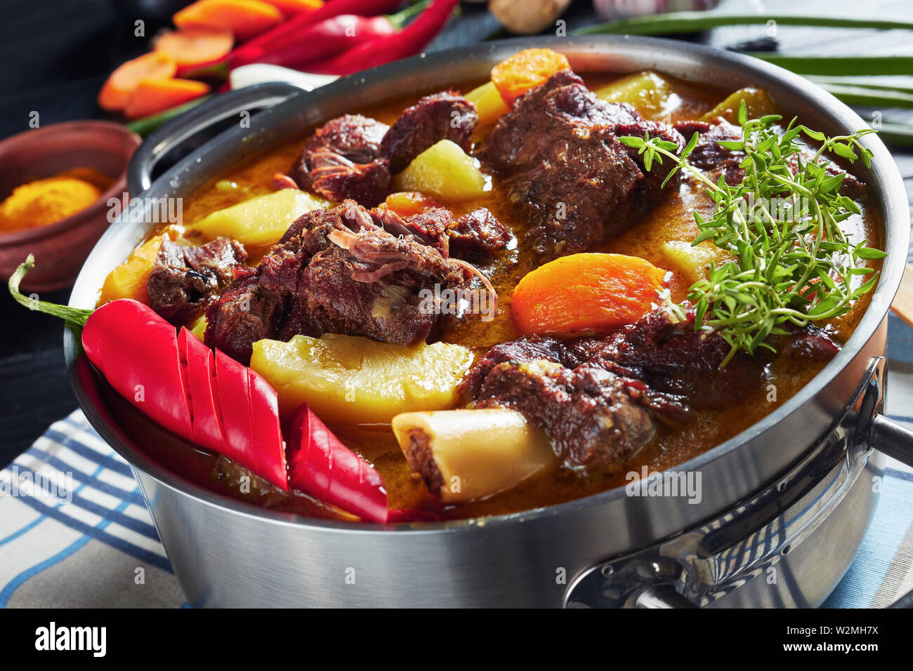 closeup of Jamaican Curried Goat slow cooked Jamaican Spiced meat and veggies Curry in a pot