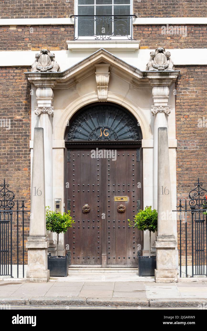 Large ornate door of 16 Charles Street, Mayfair, London, UK. Address of