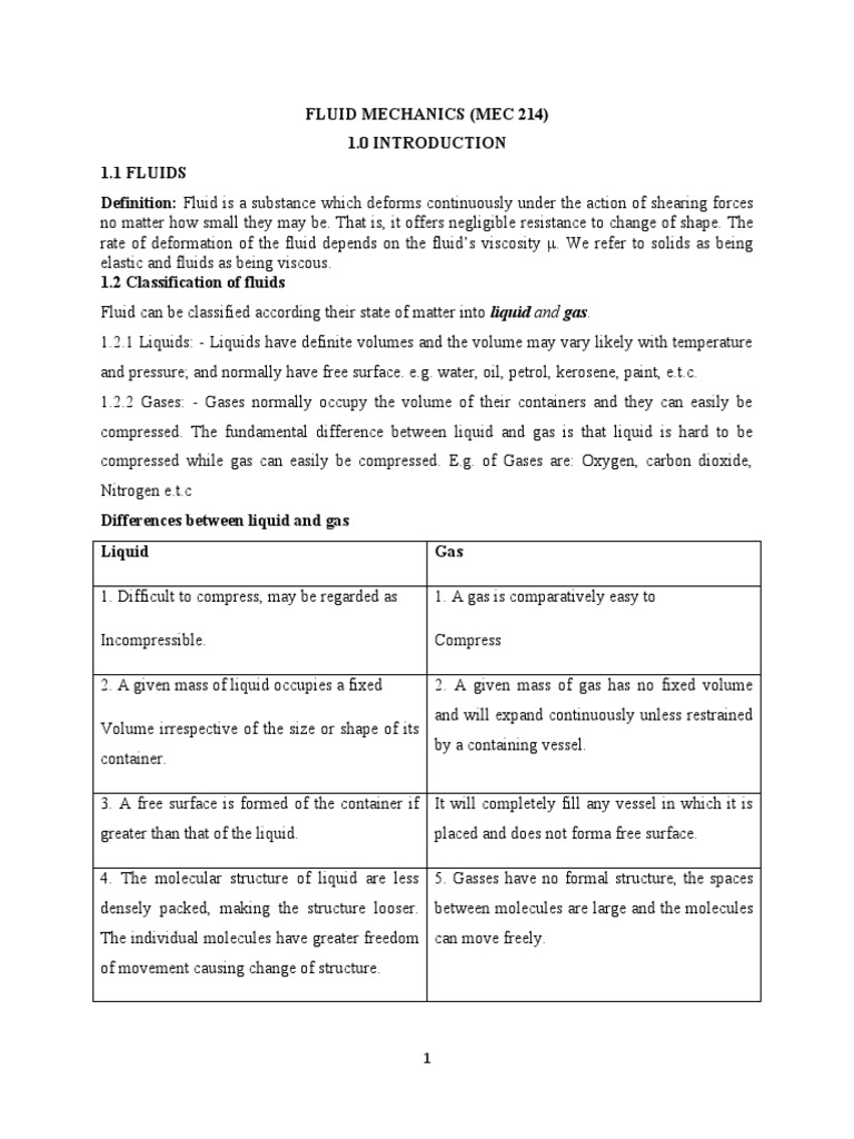 Fluid Mechanics (Mec 214) 1.1 Fluids Definition Fluid Is A Substance Fluid Mechanics Definition Pdf fluid mechanics concerns the study of the motion of fluids (in general liquids and gases) and the forces acting on them. 1.1 fluid mechanics in chemical engineering. Both liquids and gases are. 14.1 fluids, density, and pressure. this is a modern and elegant introduction to engineering fluid mechanics enriched with numerous examples, exercises, and. fluid mechanics is. Fluid Mechanics Definition Pdf.