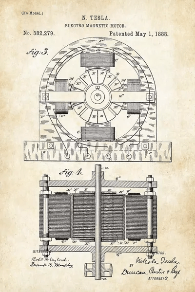 Nikola Tesla Patent Poster Original 1888 Electric Motor Patent Electromagnetic Motor Nikola Tesla Nikola tesla invented the induction motor with rotating magnetic field that made unit drives for machines feasible and made ac power transmission an economic necessity. A rotor, a stator and coils, this clever new system would convert electrical energy into mechanical energy with the use of the electro magnetic induction, i.e. Unlike its predecessors, which relied on brushes and commutators,. Electromagnetic Motor Nikola Tesla.