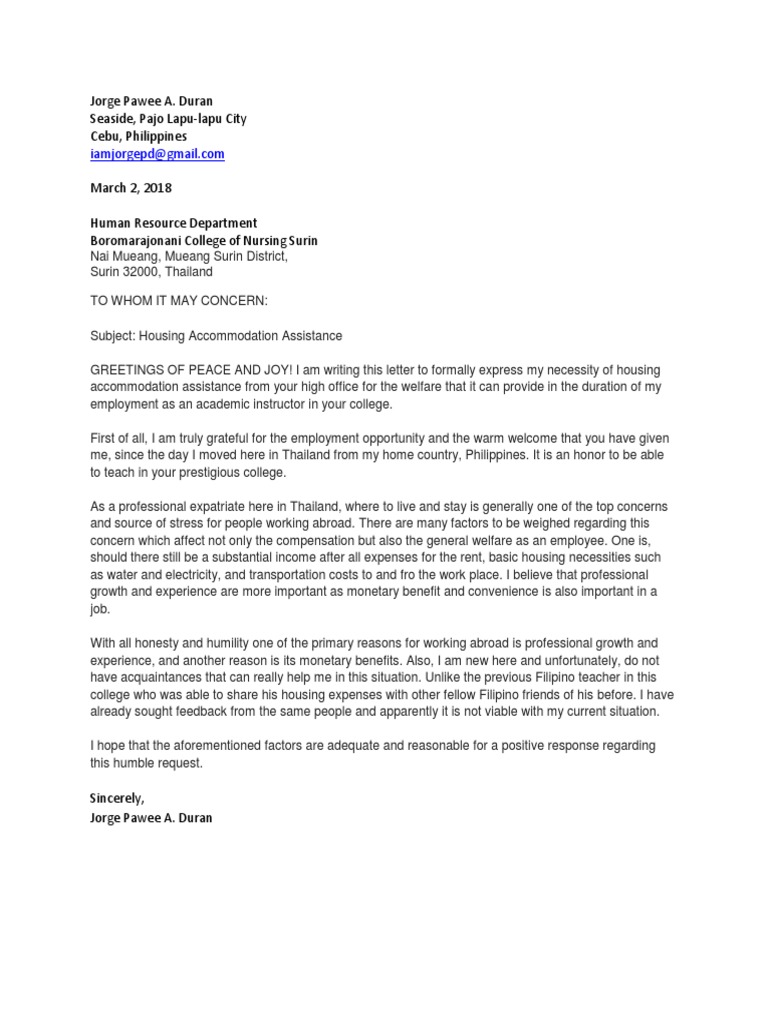 Letter for Housing Assistance