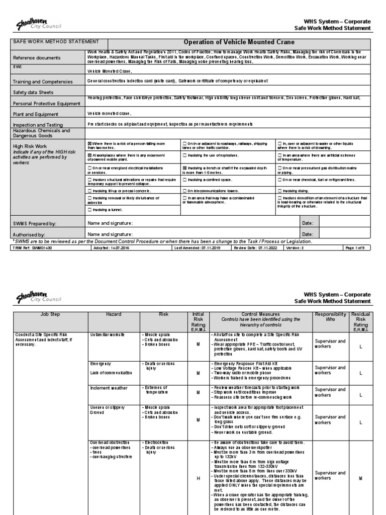 Operation of Vehicle Mounted Crane Safe Work Method Statement PDF