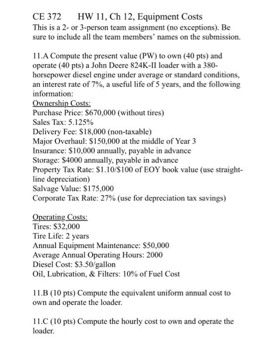 Solved CE 372 HW 11, Ch 12, Equipment Costs This is a 2or