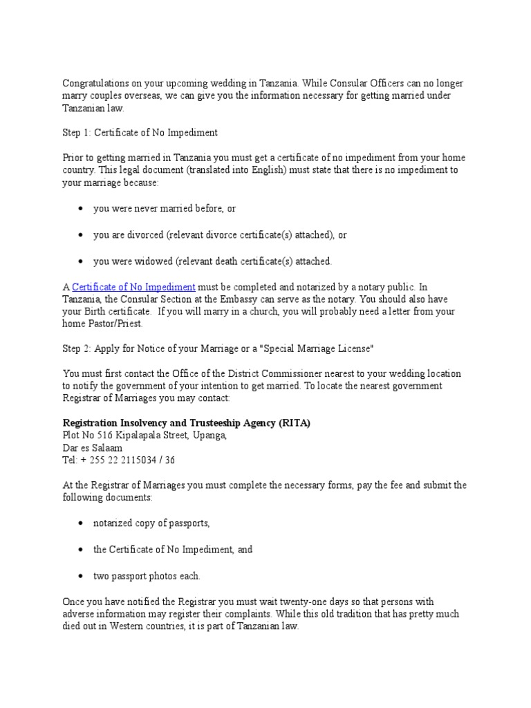 Marrying in Tanzania Download Free PDF Notary Public Marriage License