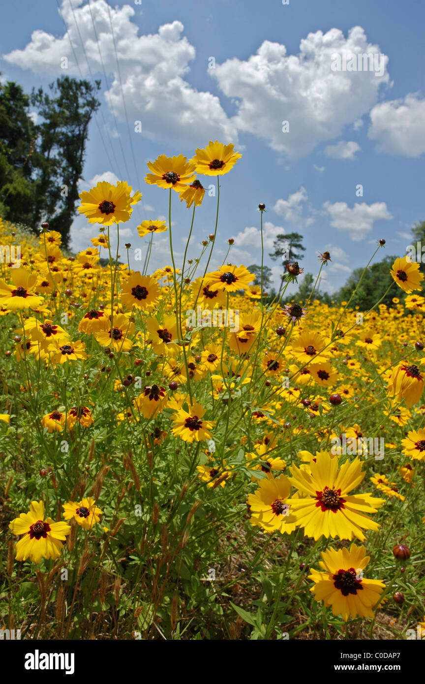 yellow coreopsis wildflowers growing alongside highway in North Florida