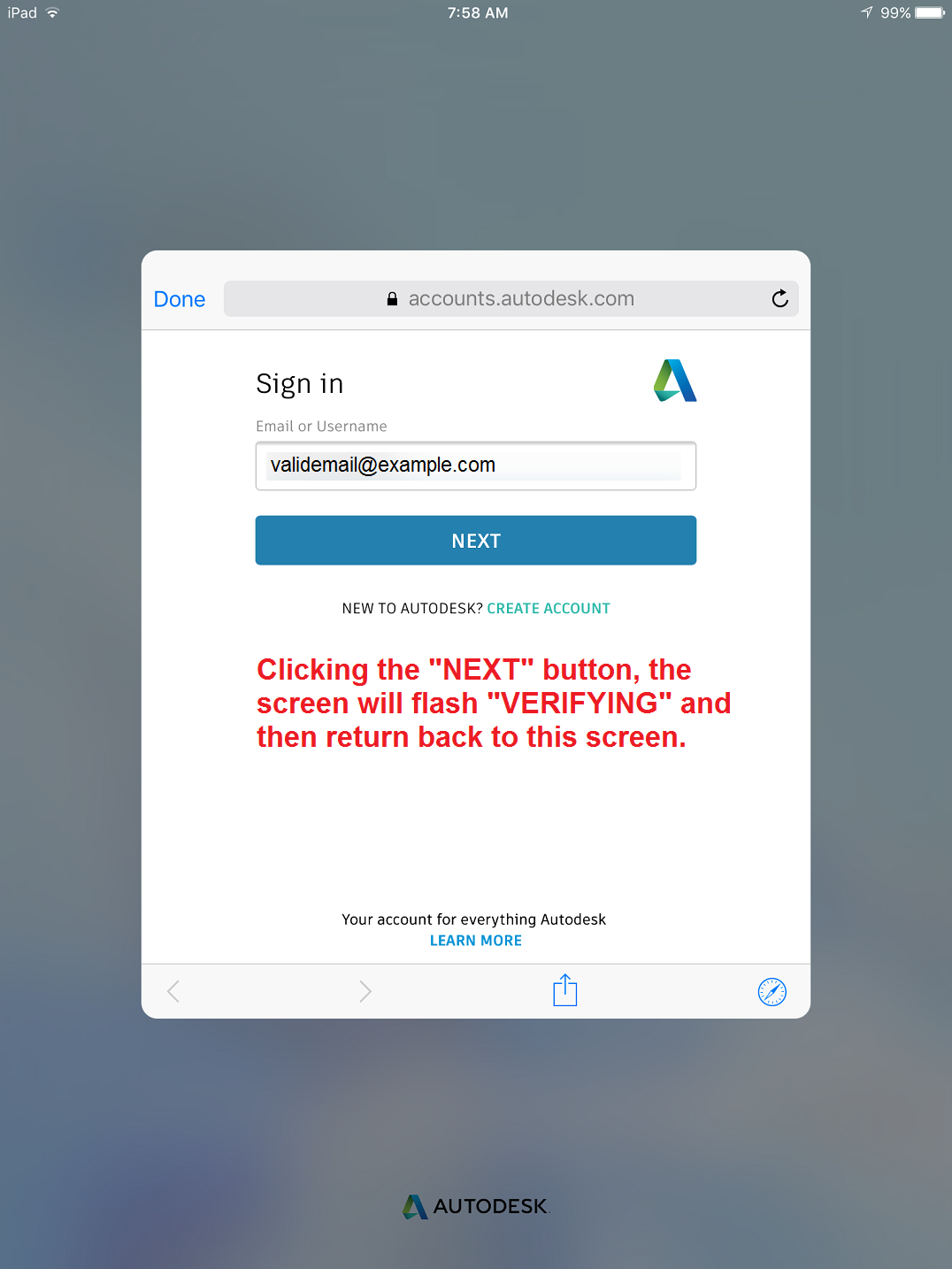 Unable to login to BIM 360 Field iPad app and after clicking "Next" the