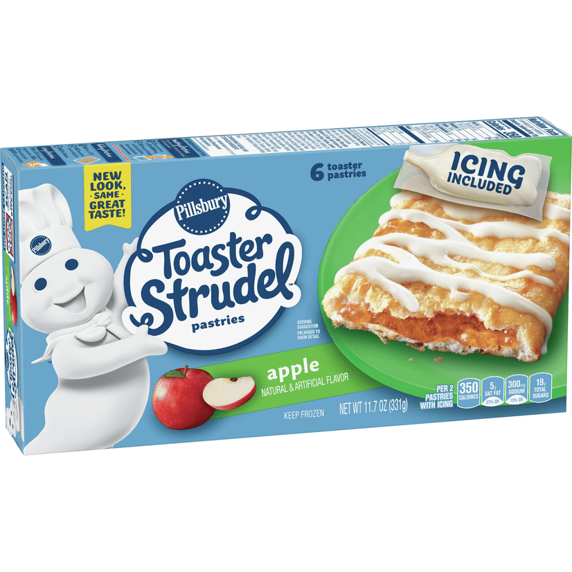 Pillsbury Toaster Strudel® Strawberry Apple Frozen Breakfast 6 ct 11.7 Apple Toaster Strudel Nutrition Facts Good source of proteins (80% of dv/100g). With every warm bite, you'll taste a flaky pastry crust, gooey filling and creamy icing. The macronutrient breakdown is 59% carbs, 36% fat, and 5% protein. 1 pastry of toaster strudel, apple flavour (pillsbury) contains 170 calories. 1 piece of apple toaster strudel, frozen (pillsbury) contains 170 calories. The macronutrient breakdown is 60%. Apple Toaster Strudel Nutrition Facts.