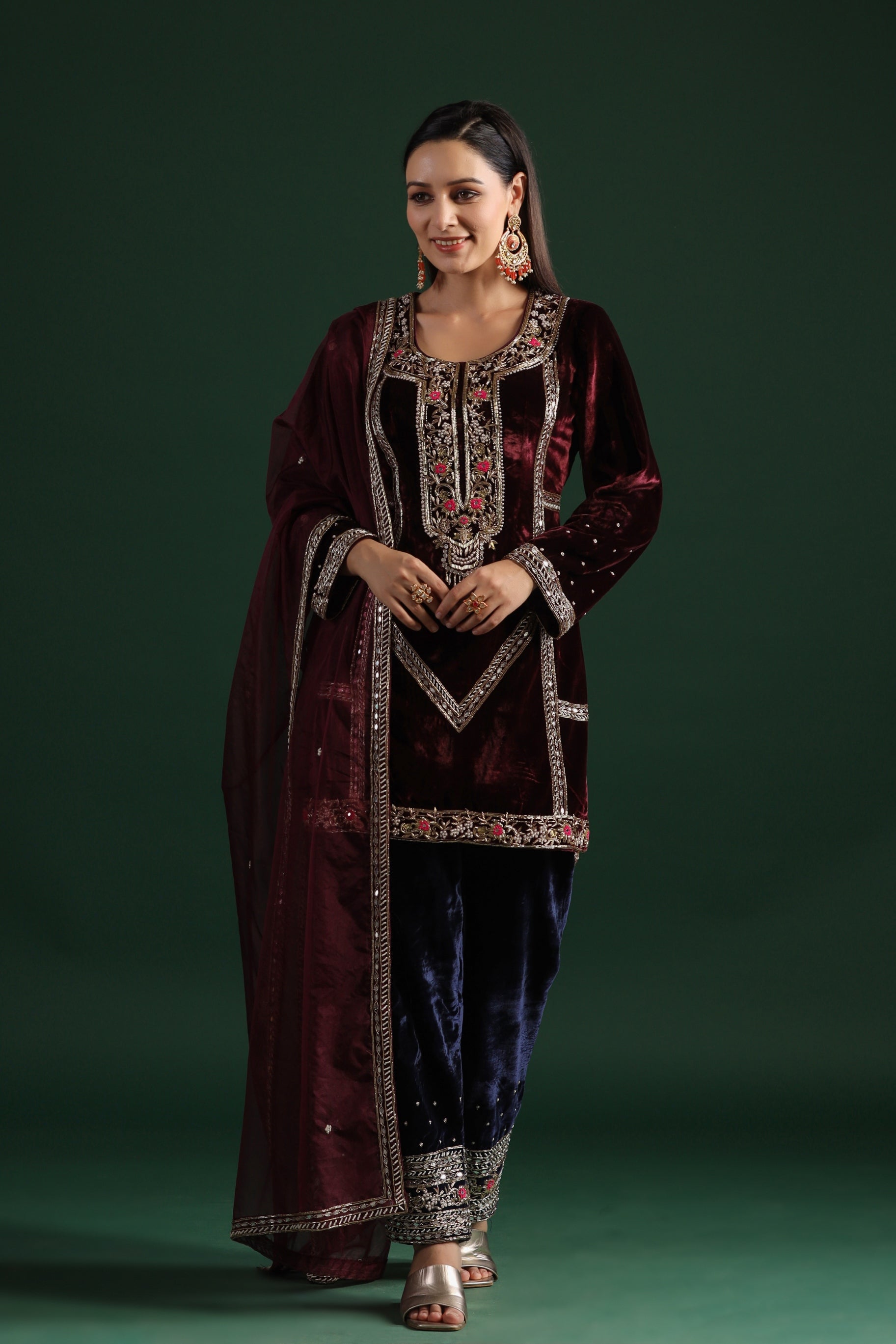 Wine Embroidered Velvet Pants Set