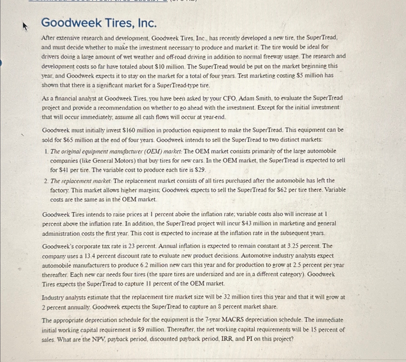 Casestudyongoodweektiresinc compress CASE STUDY ON GOODWEEK Goodweek Tires Inc After extensive research and development, goodweek tires, inc., has recently developed a new tire, the supertread, and must decide whether to make the investment necessary to produce and market. The cash flow to start the project is the $140 million equipment cost and the $9 million required for net working capital, yielding a total cash outflow today of $149 million.. Goodweek Tires Inc.