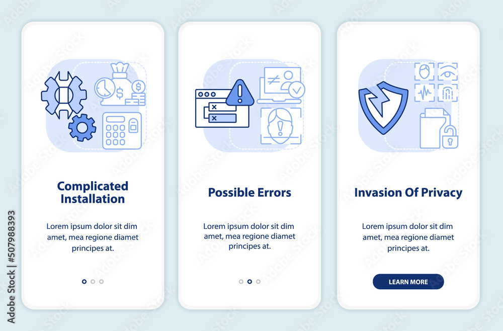 Biometrics drawbacks light blue onboarding mobile app screen. Walkthrough 3 steps editable