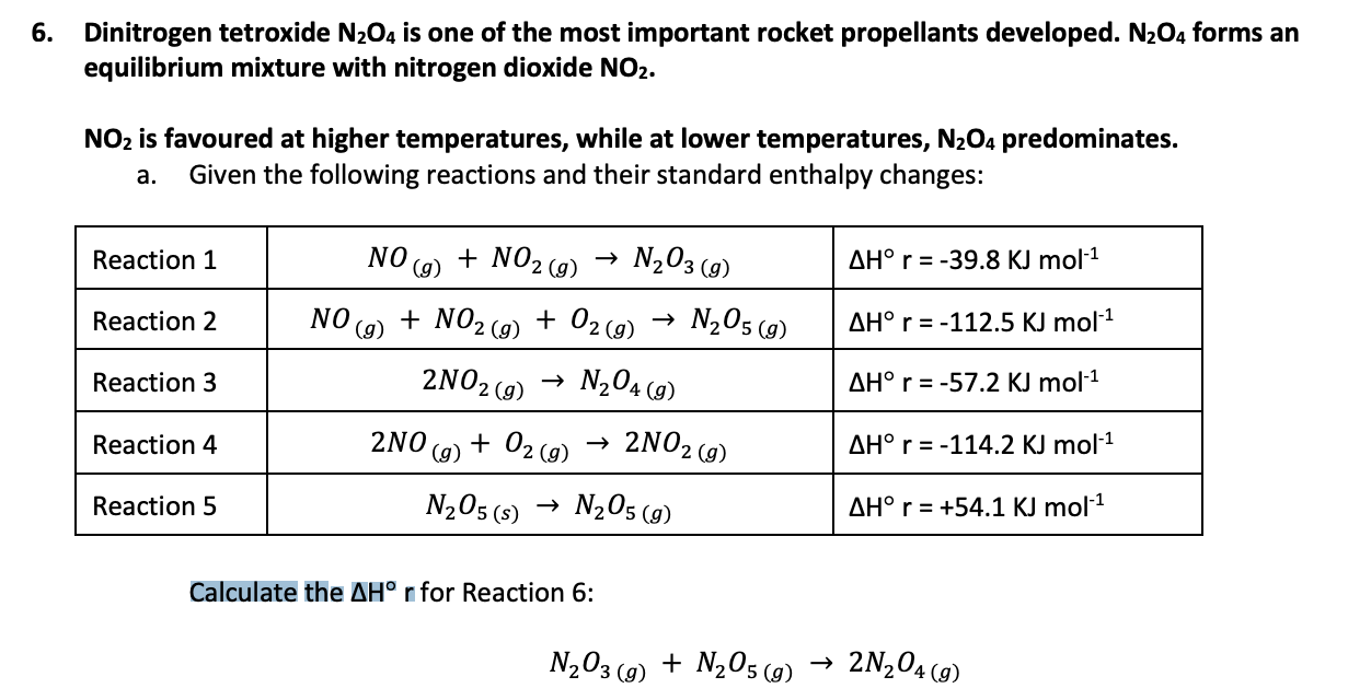 SOLVED The space shuttle Orbiter utilizes the oxidation of liquid Dinitrogen Tetroxide Standard Enthalpy Of Formation Dinitrogen tetroxide is one of the most important rocket propellants ever developed, and by the late 1950s it became the storable oxidizer of choice. 193 rows in chemistry and thermodynamics, the standard enthalpy of formation or standard heat of formation of a compound is the change of. For this compound, wtt contains critically evaluated recommendations for: Ideal gas heat capacity. Dinitrogen Tetroxide Standard Enthalpy Of Formation.