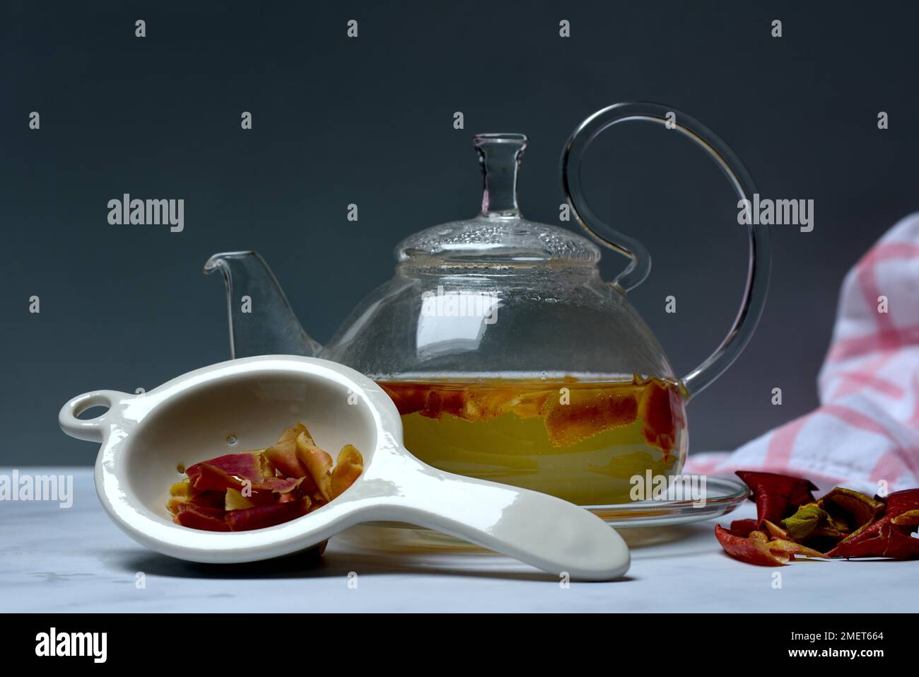 Apple peel tea in teapot and apple peel in tea strainer, apple Stock