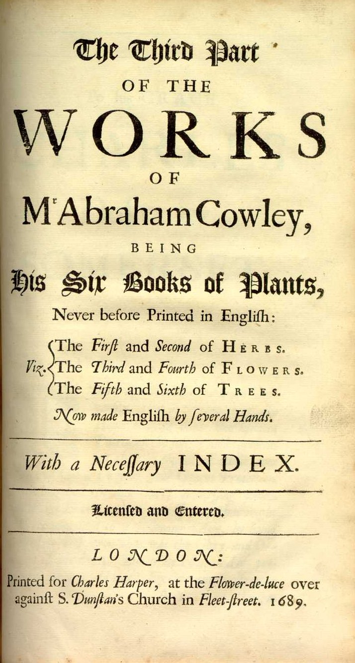 The Third Part of the Works of Mr. Abraham Cowley Being his Six Books of Plants