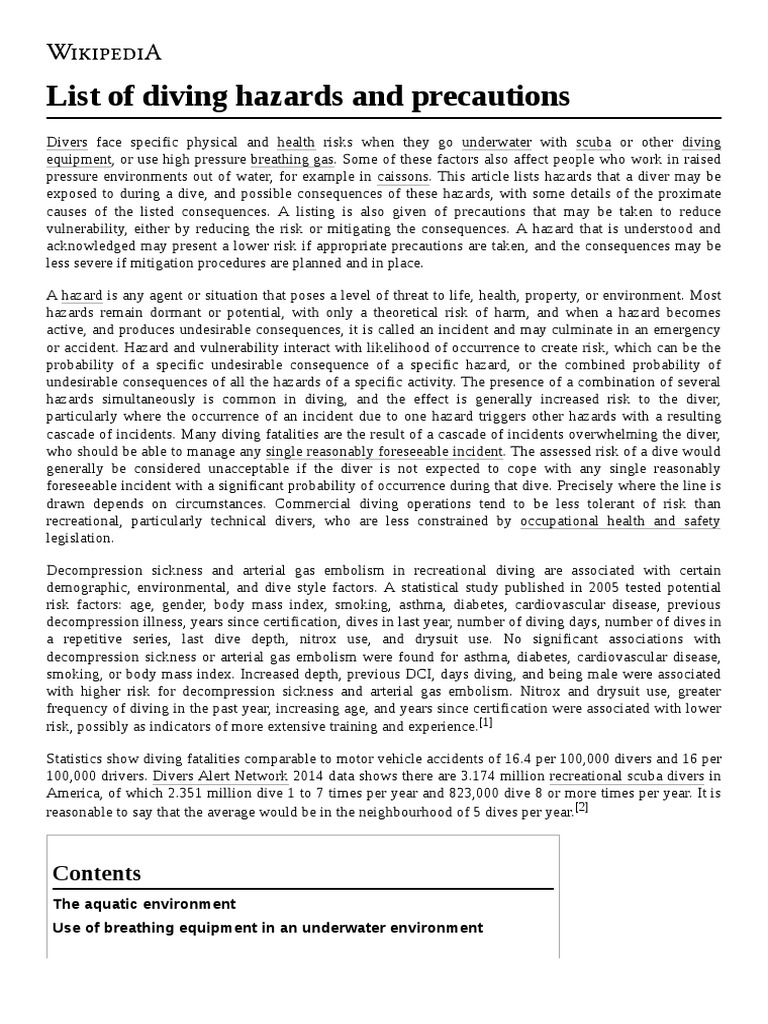List of Diving Hazards and Precautions The Aquatic Environment Use of Breathing Equipment in An