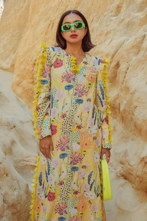Buy PS Pret by Payal Singhal Yellow Art Crepe Tassel Embellished Dress Online Aza Fashions