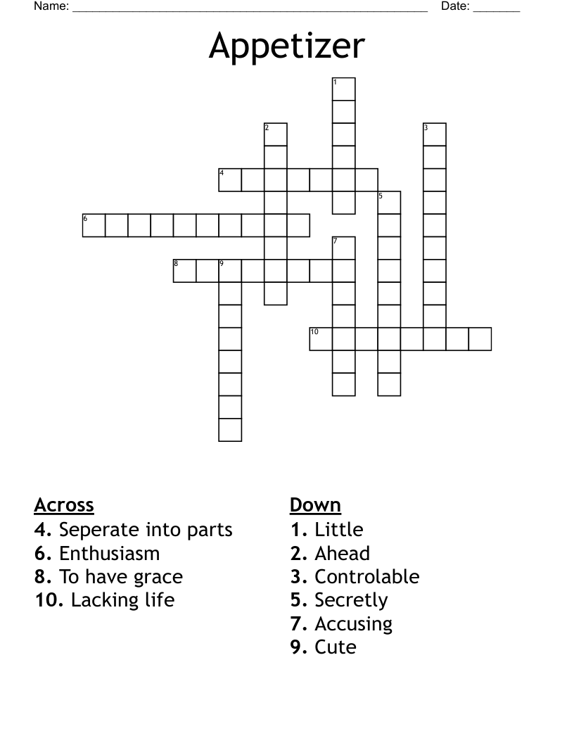 Unit 5 Appetizer Crossword Puzzle WordMint Eggplant Appetizer Crossword Answer Enter the answer length or the answer pattern to get better results. Today's crossword puzzle clue is a quick one: We will try to find the right answer to this particular crossword clue. We have 1 solution for the frequently searched for crossword lexicon term eggplant appetizer. Search for crossword clues found in the daily celebrity, ny times, daily mirror,.. Eggplant Appetizer Crossword Answer.