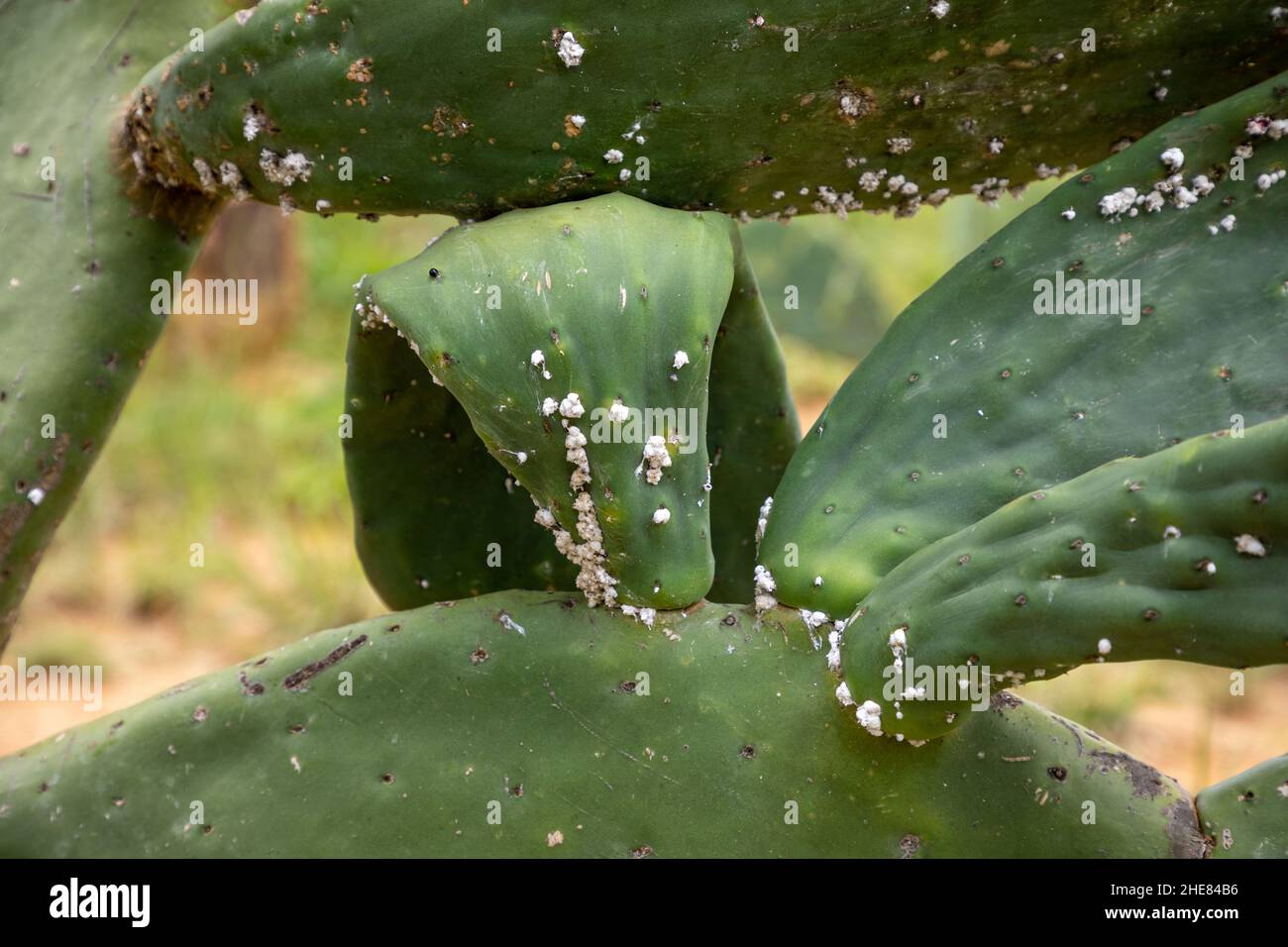Leaf of a prickly pear cactus plant. The plant has a small outbreak of