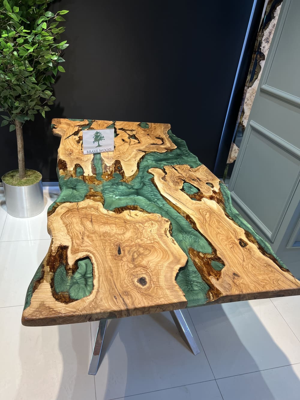 Green epoxy dining table, olive wood epoxy table by Brave Wood