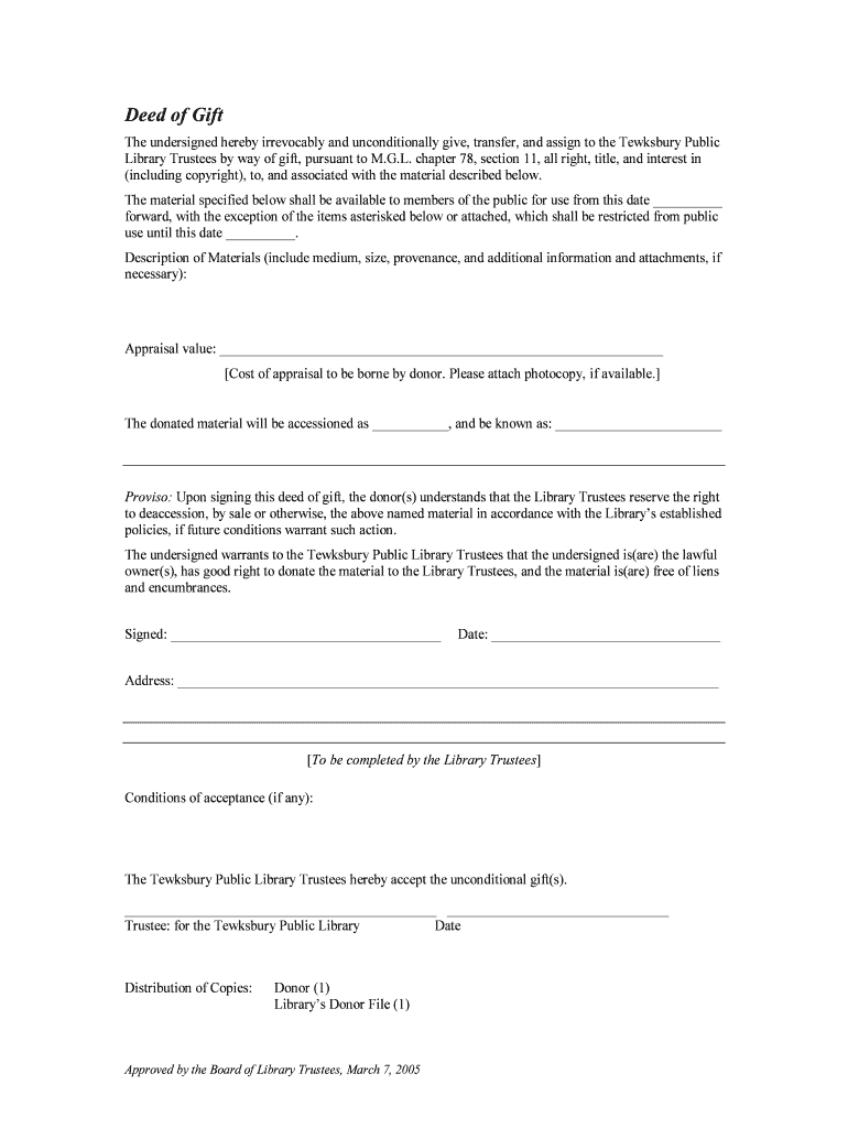 Fillable Online tewksburypl Deed of Gift Tewksbury Public Library Fax
