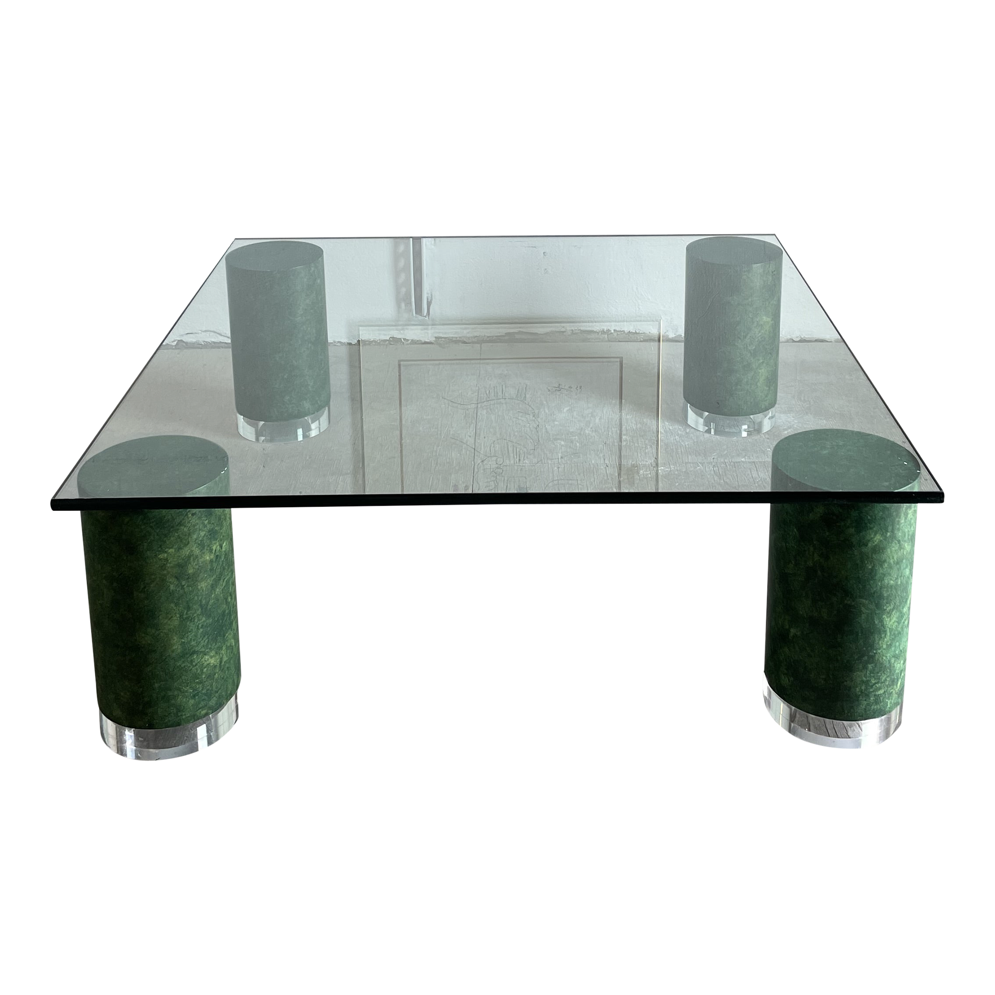 Glass Top Coffee Table on Thick Cylinder Faux Malachite/Marble Legs