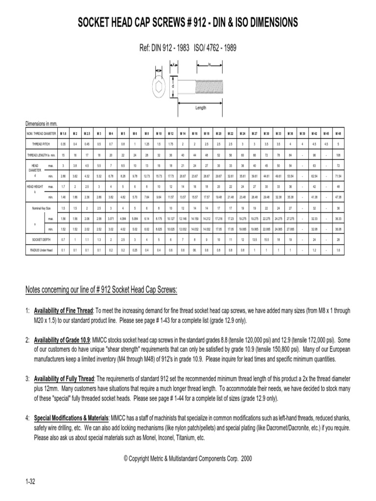 HEX SOCKET CAP SCREW ISO 4762 / JIS B1176 / DIN 912 Socket Head Cap Screws # 912 - Din & Iso Dimensions To meet \he increasing demand for fine thread socket. The din 912 standard specifies the tolerances and the variation in form of socket head cap screws, for sizes m1.4 up to and including m100. Bolt king can manufacture cap. Dimensional standard for din 912 socket head capscrews, which shares many characteristics with iso 4762. Mechanical properties for these items are. Socket Head Cap Screws # 912 - Din & Iso Dimensions.