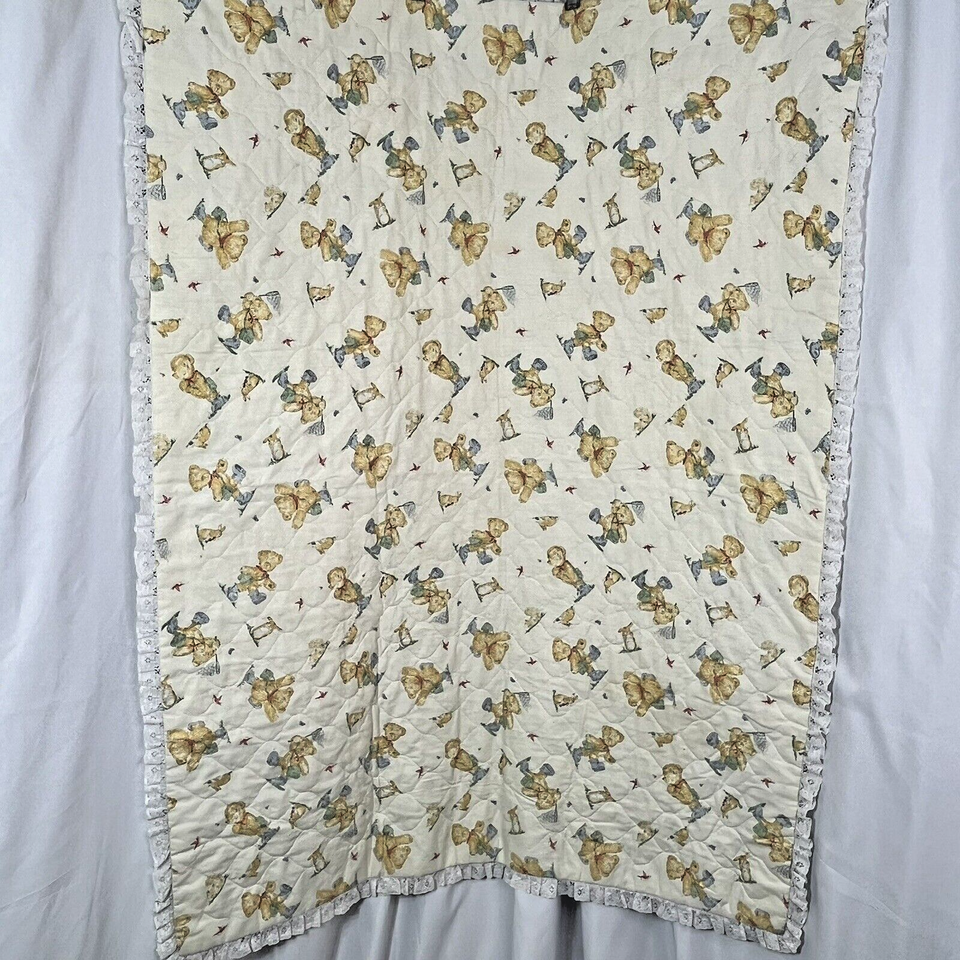Baby Blanket Quilt Rambling Ted Bear Teddy Cub 43x34 Handmade Lace
