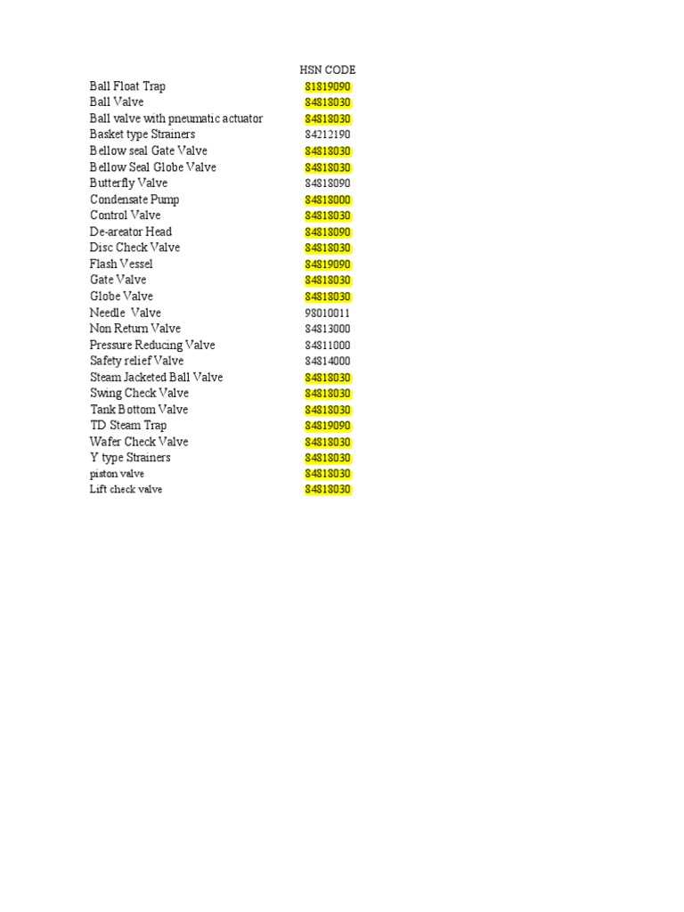 List of HSN CODE used in Valve Industry PDF