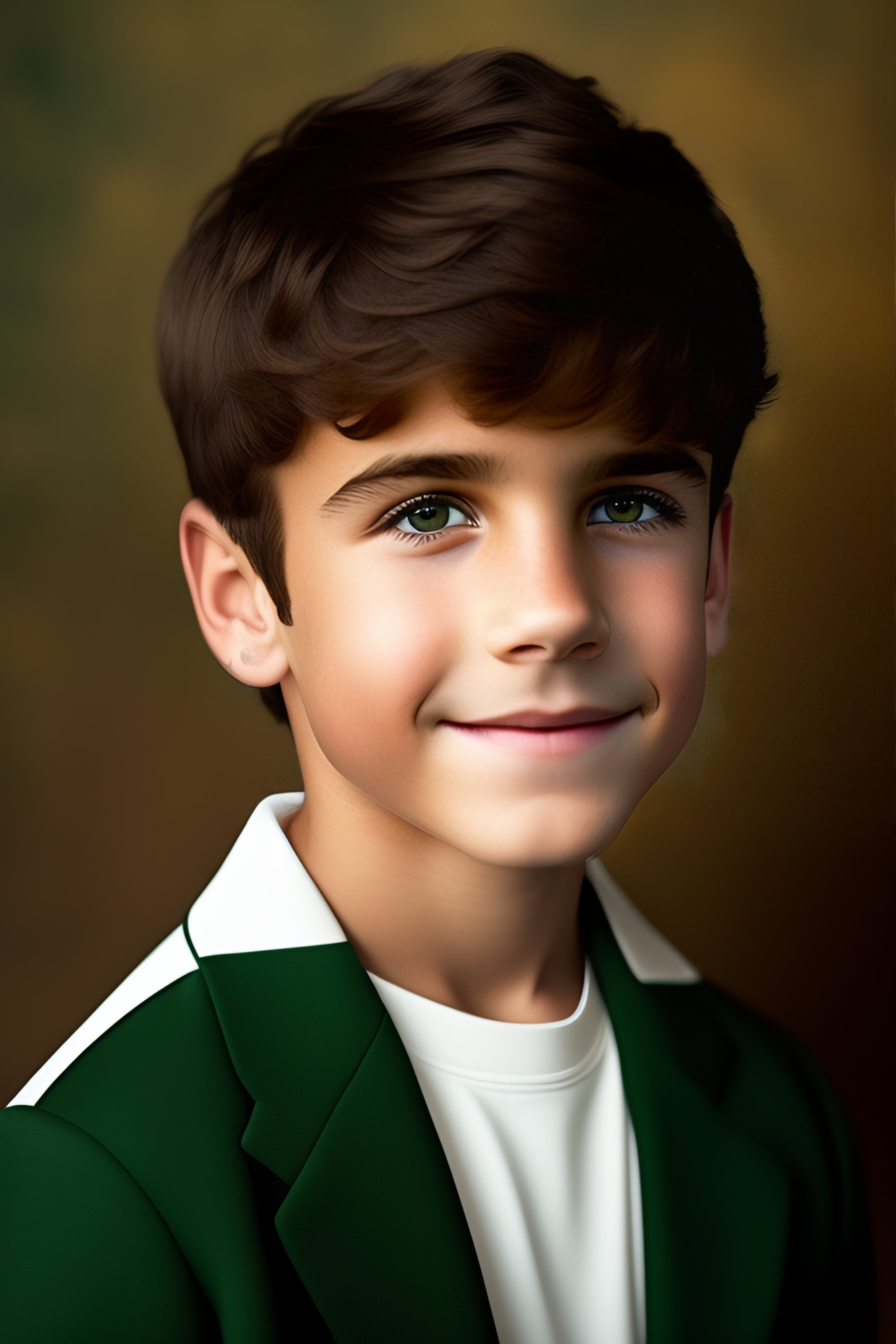 Lexica A boy with short brown hair and dark eyes wearing a dark green
