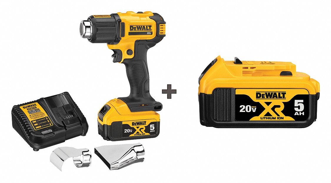 DEWALT, 20V DC, 500° to 750° F, Heat Gun Kit 326ZM4DCE530P1/DCB205 Dewalt Cordless Heat Gun Run Time This 20v max* cordless heat gun is compact for use in tight spaces and diverse applications, including heat shrinking wire tubing and paint and decal removal. Up to 42 minutes of runtime per charge*** 6.7cfm**** view more features. It features up to a. From heat shrinking wire tubing to paint and decal removal, this cordless heat gun gets the job. Dewalt Cordless Heat Gun Run Time.
