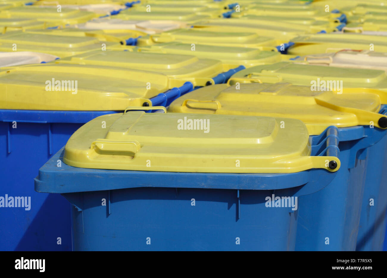 Yellow and blue tons, recycling bins, lids Stock Photo Alamy