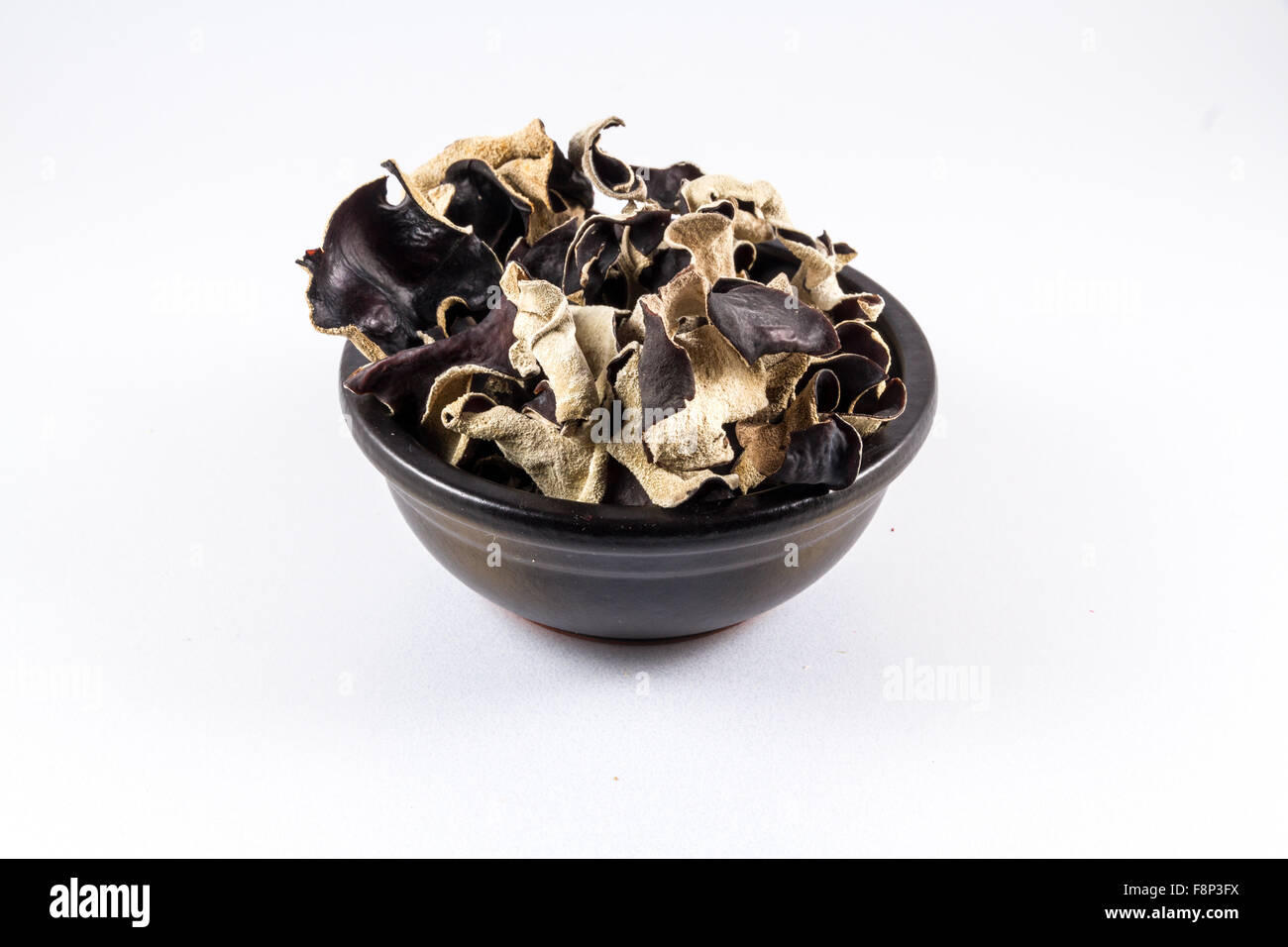 Black ceramic bowl with dried mushrooms piled in, Auricularia