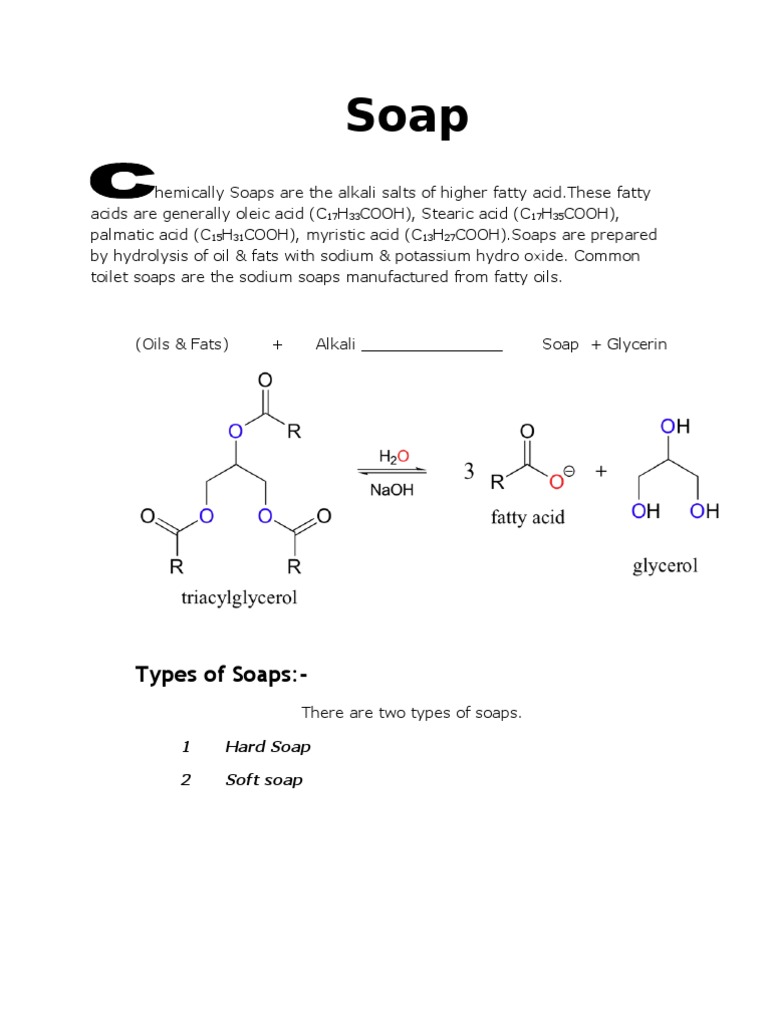 This combination creates clusters of soap, water, and grime called micelles. The most common examples of such compounds are soaps and detergents, four of which are shown below. Note that each of these molecules has a nonpolar hydrocarbon chain,. Soap has the general chemical formula rcoox. Soap is a classic cleaning agent that has been used for centuries. Its fundamental chemistry involves the combination of fats or oils with an alkaline substance,. Soaps are sodium or potassium fatty acids salts, produced from the hydrolysis of fats in a chemical reaction called saponification. The x represents an alkali metal, an element in the first column on the periodic. How soap works is due to its unique chemistry, the hydrophilic (loves water) and hydrophobic (hates water) parts of soap act to combine soapy water with grease, dirt, or oil. Soap molecules have on one end what’s known as a polar salt, which is hydrophilic, or attracted to water.