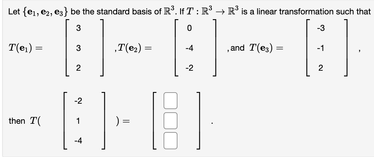 Solved Let {e1,e2, e3} be the standard basis of R3. If T R3 Standard Basis Of R3 The standard basis is $e_1 = (1,0,0)$, $e_2 = (0,1,0)$, and $e_3 = (0,0,1)$. Thus = fi;j;kgis the standard basis for r3. In particular, \(\mathbb{r}^n \) has dimension \(n\). Definition (a basis of a subspace). T(⎡⎣⎢1 0 0⎤⎦⎥), t(⎡⎣⎢0 1 0⎤⎦⎥), t(⎡⎣⎢0 0 1⎤⎦⎥). We’ll want our bases to. So if $x = (x,y,z) \in \mathbb{r}^3$, it has the form. Standard Basis Of R3.