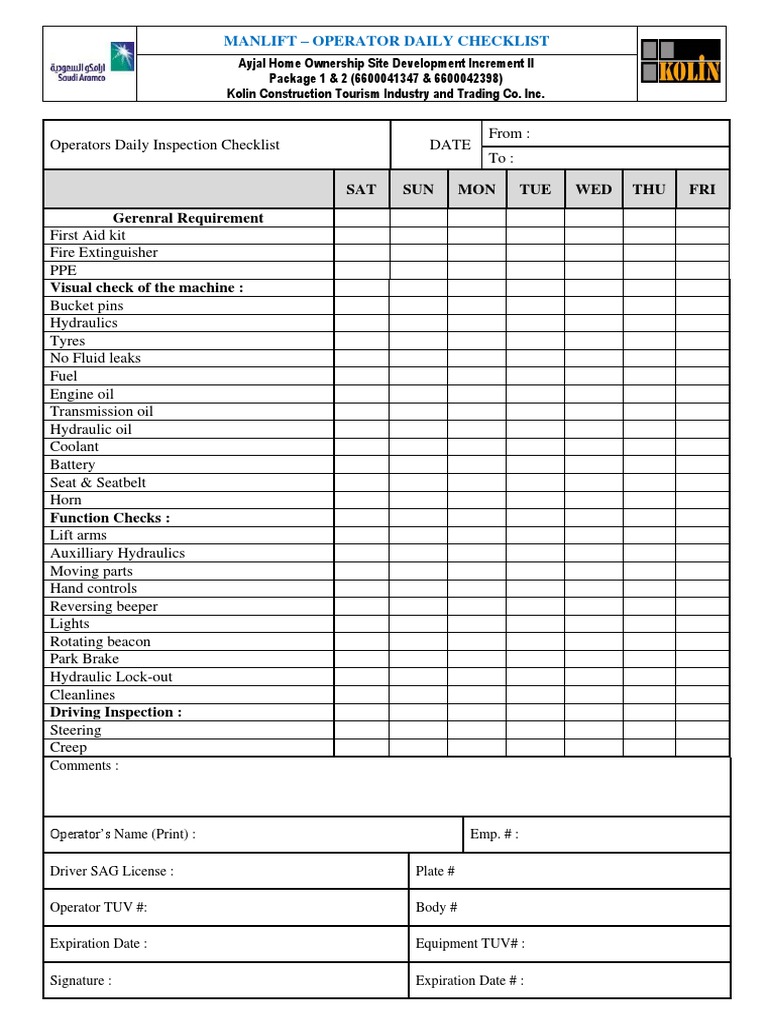 Printable Forklift Safety Checklist Printable Templates Man Lift Daily Inspection Checklist Pdf See manufacturer guidelines for use in windy conditions (always lower if lift begins to rock in the wind) floor/ground conditions: If the aerial lift fails any part of this inspection, remove the key and report the problem to your supervisor. 2 check to see if all oil, hydraulic, fuel and coolant. The following items must be checked daily, prior to. Man Lift Daily Inspection Checklist Pdf.