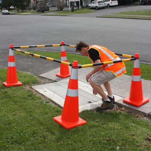 Traffic Cone Bar Cone bars are compatible with regular, grabber and looper traffic cones and tubes. The retractable bar is extremely versatile for road and utility work sites, great for parking lots and pedestrian cross ways, and many more areas. These products are designed to alert. Single side extendable cone bar. Light weight easy to carry or transport. With reflective bands for increasing. Traffic Cone Bar.