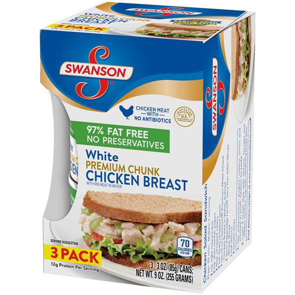 Swanson white premium chunk chicken breast in water, 3 3oz. cans 9oz Premium Chunk White Chicken In Water 35% less sodium white premium chunk chicken breast. chunk white chicken in water with flavoring. two (2) 12.5 oz cans of swanson white premium chunk canned chicken breast in water ; swanson white and dark premium chunk canned chicken breast in water, fully cooked chicken, 9.75 oz can (case of 12) brand: Our premium white chicken. Premium Chunk White Chicken In Water.