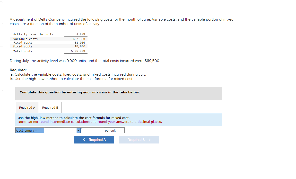 Solved A department of Delta Company incurred the following Mixed Cost Per Unit Graph Where y is the total mixed cost, a is the fixed cost, b is the variable cost per unit, and x is the level of activity. A= the total fixed costs. A mixed cost is expressed by the algebraic formula y = a + bx, where: Define and outline examples of mixed costs in retail and manufacturing businesses. B is. Mixed Cost Per Unit Graph.