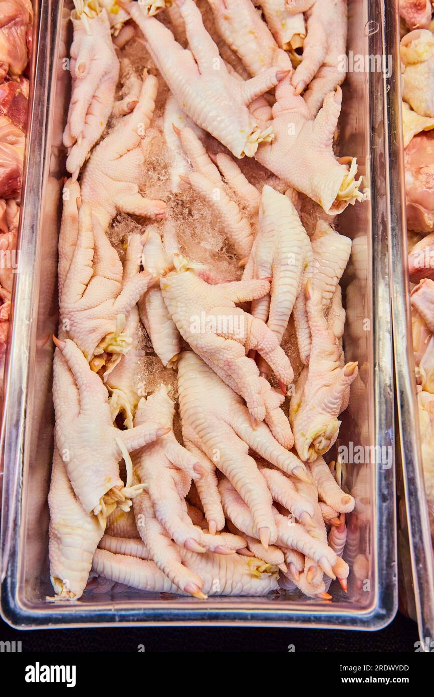 Container raw chicken feet, meat department, grocery store, uncooked