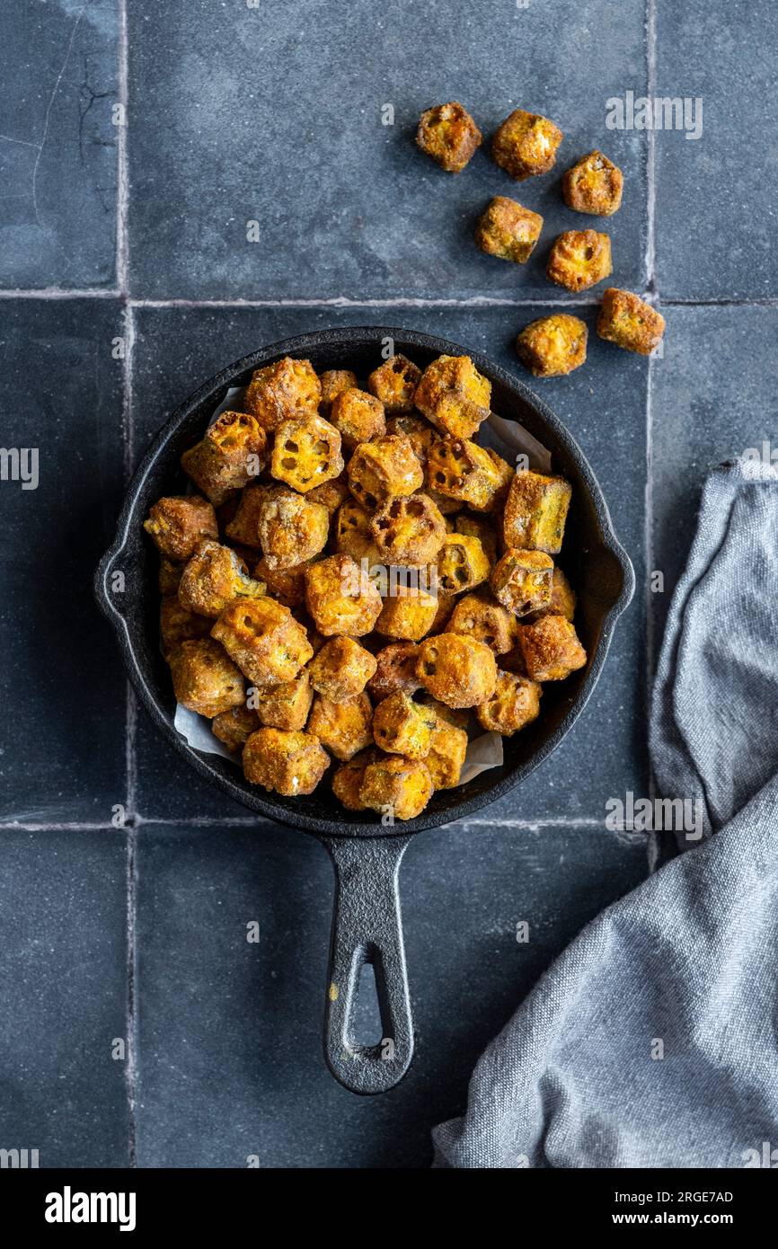 Breaded fried okra in a small cast iron pan photographed on a grey