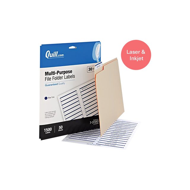 Quill File Folder Labels Template Learn how to make your own file folder labels for your home office filing system! Create handwritten file label stickers with ease or use your laser or inkjet printer for a more professional finish; Grab the free printable file folder labels. Download and use to set up label sheets for your laser or inkjet printer. Free laser and inkjet labels. Quill File Folder Labels Template.