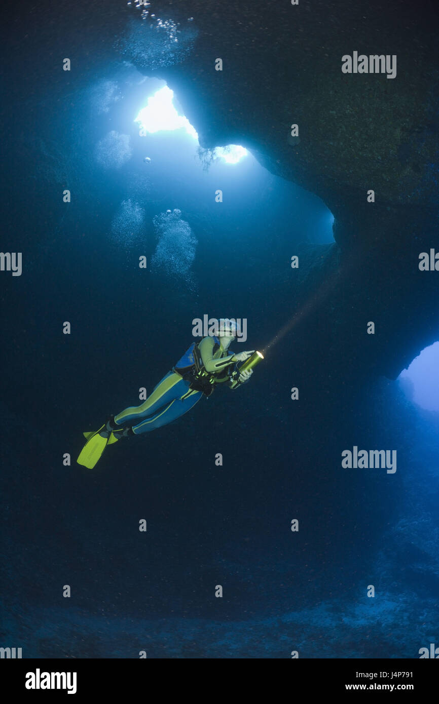 Underwater recording, diver, pit, back light Stock Photo Alamy