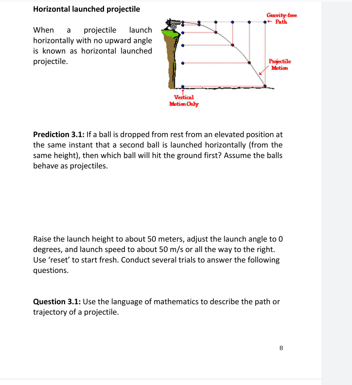 Solved Horizontal launched projectile Gravityfree • Path