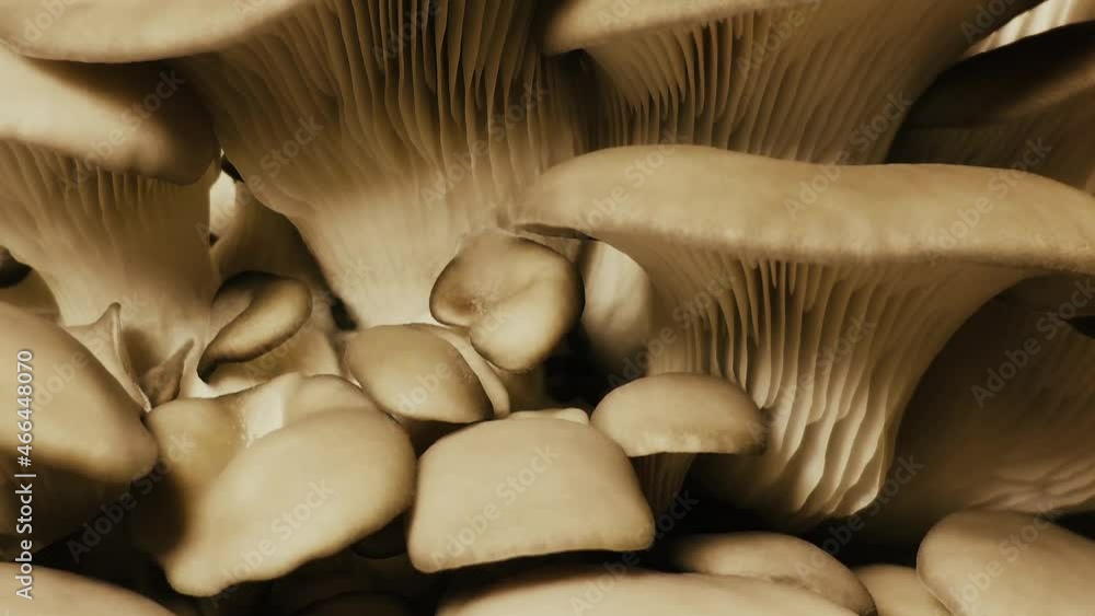 Growing mushrooms time lapse. Mycelium closeup yellow light. Edible mushrooms pattern