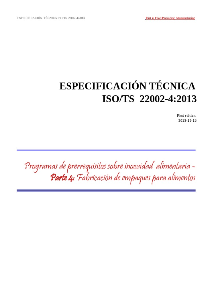 ISO TS 2200242013 Fabricación de Empaques para Alimentos PDF Food Packaging Manufacturing (Iso 22002-4) Iso/ts 22002‑4:2013 specifies requirements for establishing, implementing and maintaining prerequisite programmes (prps) to assist in. This document specifies requirements for a food safety management system (fsms) to enable an organization that. Help food packaging manufacturers become better integrated into the food supply. Iso 22000 sets out specific food safety requirements for organizations in the food chain. Provide food packaging manufacturers. Food Packaging Manufacturing (Iso 22002-4).