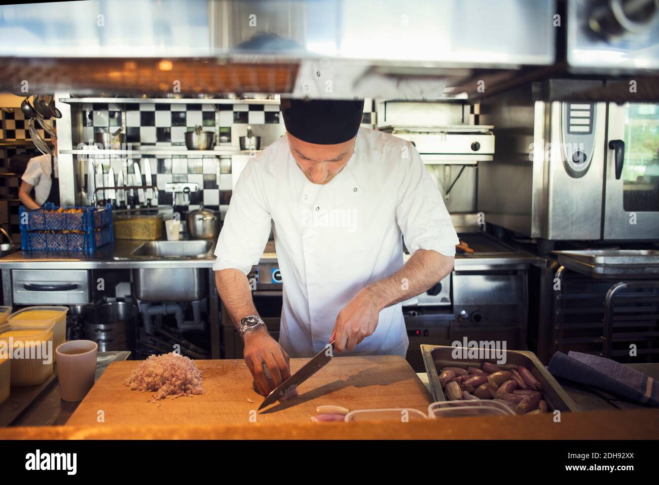 Chef chopping onion cutting board in restaurant kitchen Stock Photo Alamy