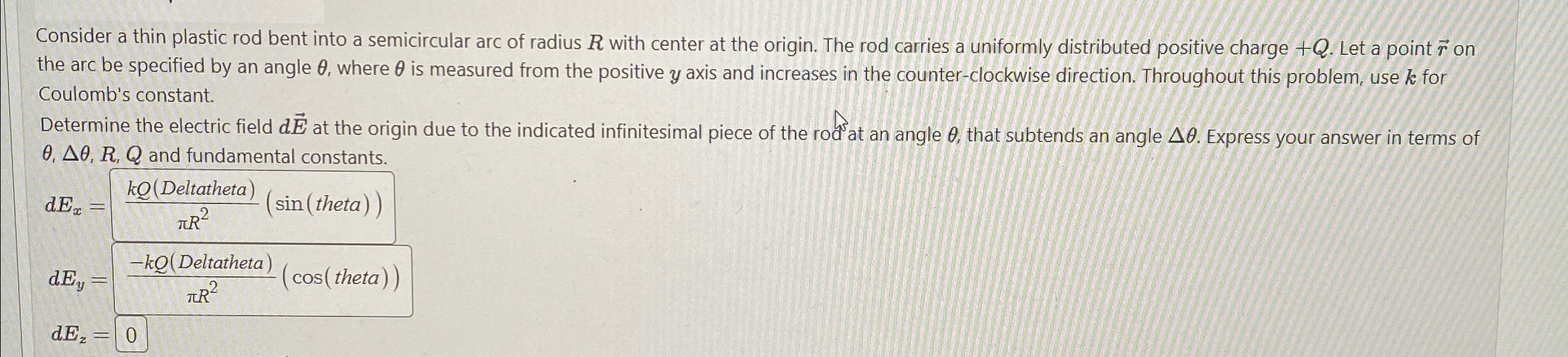 SOLVED Problem 6 5/7 points (graded) Consider a thin plastic rod bent Thin Plastic Rod Bent Into Arc Consider a thin plastic rod bent into an arc of radius $r$ and angle a $\sim$ (figure 15.54 ). Consider a thin plastic rod bent into a semicircular arc of radius r with center at the origin (figure 15.57). Consider a thin plastic rod bent into a semicircular arc of radius r with the center at the origin, as shown. Thin Plastic Rod Bent Into Arc.