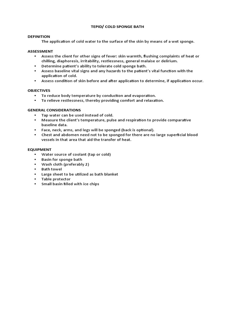 TEPID Sponge Bath PDF Towel Hypothermia Sponge Bath Medical Abbreviation Daily baths with chg are helpful for people in intensive care units (icus). This gentle technique is particularly beneficial in managing hyperthermia and alleviating discomfort associated with elevated body temperatures. Your nurse will do the bath using freshly washed hands and new gloves. • provide patient with a mesh sponge, which allows chg to lather well and aids application to. Sponge Bath Medical Abbreviation.