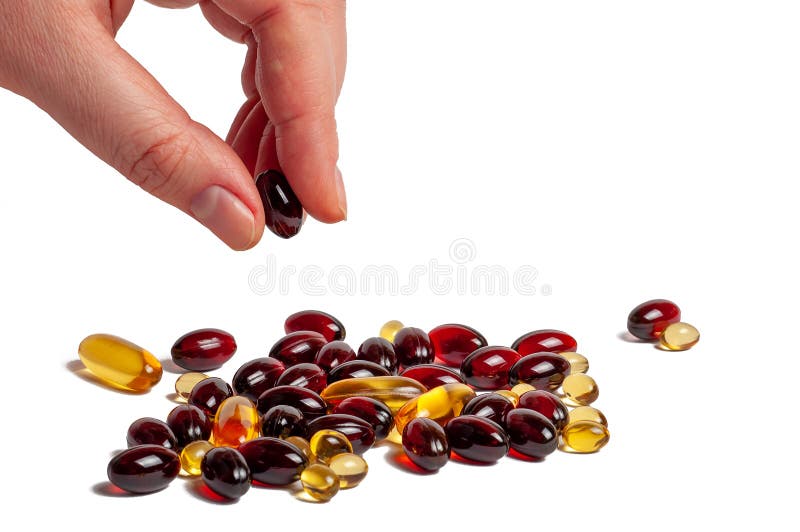 A Hand Picking Up a Supplement from a Pile of Various Capsules. Stock Photo Image of label