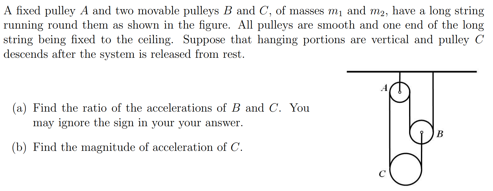 Solved A fixed pulley A and two movable pulleys B and C, of Pulley System Problems And Solutions This lesson covers advanced techniques to deal with complex pulley systems, especially those including two. A bucket with mass m2 and a block with mass m1 are. Set up the system of equations. Know about free body diagrams (fbd), the tension in strings, etc. Intro to pulleys and constraints. Video, written explanations and a simple 3 step framework to solve. Pulley System Problems And Solutions.